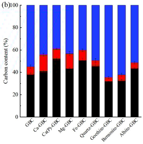 Distribution of carbon in phragmite biochar (a) and goldenrod biochar (b). PBC and GBC represented the original biochars derived from phragmite and goldenrod, respectively. The prefix of Ca, Ca(P), Mg, Fe, Quartz, Goethite, Bentonite and Albite meant the CaCl2, Ca(H2PO4)2, MgCl2, FeCl3, quartz, goethite, bentonite and albite was added to raw biomass in the process of biochar production.