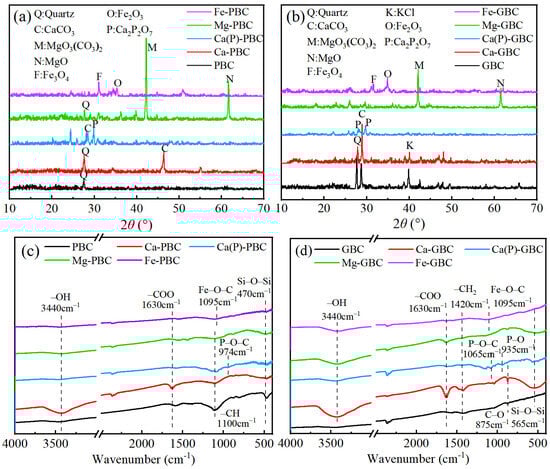 The crystals on the biochar surface were detected by XRD (Figure 3a,b), and the metal oxides in biochar were detected by XRF (Table S2), which revealed that compared to original biochars, the mineral-loaded biochars contained abundant minerals. CaCO3 was detected in biochar loaded with CaCl2, and Ca2P2O7 was detected in biochar loaded with Ca(H2PO4)2. MgO and MgO3(CO3)2 were detected in biochar loaded with MgCl2. Fe2O3 and Fe3O4 were detected in biochar loaded with FeCl3. Compared to the original biochar, the CaCO3 content in Ca-PBC and Ca-GBC increased from 1.2% wt and 6.2% wt to 16.4% wt and 20.6% wt, respectively. Similarly, the CaCO3 content in Ca(P)-PBC and Ca(P)-GBC rose to 9.2% wt and 11.3% wt, respectively. The loading of MgCl2 also resulted in an increase in MgO content in Mg-PBC and Mg-GBC from 0% wt to 6.3% wt and 7.8% wt, respectively. Furthermore, the addition of FeCl3 lead to an increase in Fe2O3 content in Fe-PBC and Fe-GBC from 0.01% wt and 0.02% wt to 10.3% wt and 9.4% wt, respectively, while the Fe3O4 content increased from 0 to 5.1% wt and 7.2% wt, respectively. Some studies also reported that MgO3(CO3)2 and CaCO3 generated from the conversion of MgCl2 and CaCl2 during pyrolysis [,]. Those newly formed minerals changed the evolution process of carbon structure. On the one hand, Ca2+ could catalyze biomass decomposition, and on the other, CaCO3 could act as a coating layer, suppressing the release of organic small molecules []. When the temperature reached 500 °C, a greater number of iron ions could capture oxygen atoms from the biochar, leading to the formation of various forms of iron oxides (such as Fe2O3 and Fe3O4) [], Ca(H2PO4)2 decomposed into insoluble calcium pyrophosphate (Ca2P2O7) [], and these newly formed metal complexes provided physical isolation to reduce carbon loss caused by high temperatures. Ren et al. [] reported that Mg and Ca could form surface compounds that acted as a physical barriers. Phosphorus-containing substances with aromatic rings formed in pyrolysis were a crucial factor influencing the stability of biochar []. FTIR spectra of biochar loaded with CaCl2 exhibited an obvious peak at 3440 cm−1, corresponding to the stretching vibration of –OH groups, whereas no such peak was present in the spectra of biochars loaded with other soluble salts (Figure 3c,d). It was likely due to the formation of CaCl2·2H2O or Ca(OH)2 during the cooling stage [], which did not occur in biochars loaded with Ca(H2PO4)2, MgCl2, or FeCl3. FTIR analysis revealed distinct chemical interactions in mineral-impregnated biochars. The Ca(H2PO4)2-modified biochar exhibited characteristic absorption bands at 974 cm−1 and 1065 cm−1, corresponding to P–O–C stretching vibrations, along with a prominent P–O vibration peak at 935 cm−1 []. Similarly, FeCl3-impregnated biochar demonstrated a distinct Fe–O–C stretching vibration at 1095 cm−1 []. These spectral features collectively demonstrate the formation of metal–carbon coordination bonds during pyrolysis, consistent with the carbon-mineral interaction mechanism proposed by Nan et al. [], where phosphorus/silicon-containing compounds induce crosslinked networks through P–O–C, C–P, or C–Si–C bonds. Notably, the CaCl2-modified biochar showed significantly enhanced peak intensities compared to other modified counterparts (Figure 3c,d). Additional spectral signatures included a carboxylate (–COO−) stretching vibration at 1630 cm−1, Aliphatic C–H vibrations at 1100 cm−1 (CH deformation), and 1420 cm−1 (CH3 symmetric bending). The observed crosslinked structures, particularly the P–O–C and Fe–O–C configurations, are proposed to function as dense protective shells []. These architectures likely impede the outward diffusion of low-molecular-weight carbon species from pyrolyzing particles, thereby enhancing carbon sequestration efficiency through physical encapsulation and chemical stabilization mechanisms [].