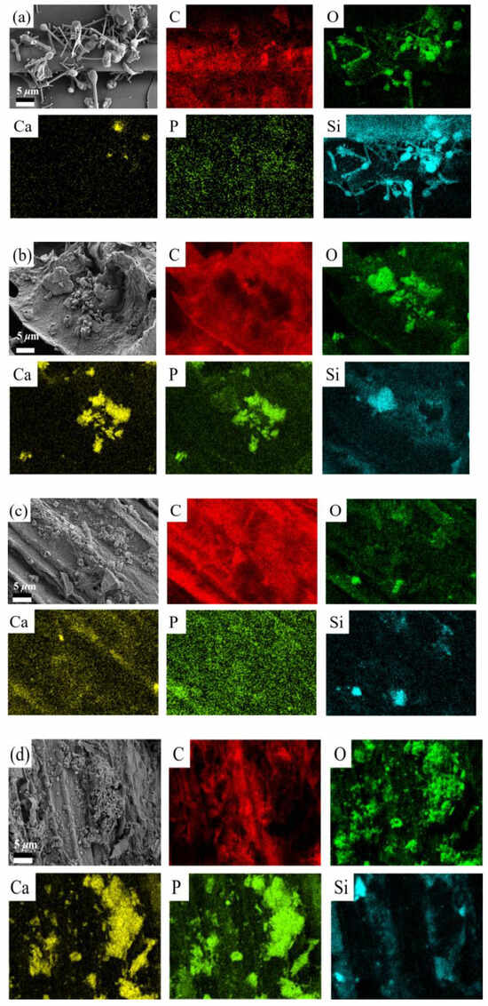 The SEM mapping of PBC (a), Ca(P)-PBC (b), GBC (c), and C(P)-PBC (d).