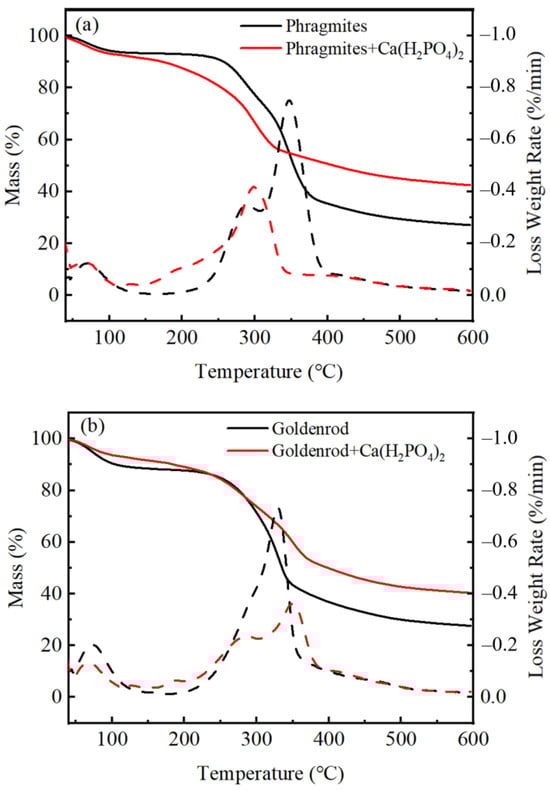 To elucidate the impact of Ca(H2PO4)2 on biomass during pyrolysis, TGA was conducted under a N2 atmosphere to simulate the thermal decomposition process of biomass (Figure 5). Both raw and Ca(H2PO4)2-loaded biomass exhibited three distinct peaks, corresponding to moisture evaporation, cellulose decomposition, and lignin decomposition []. For phragmites, the addition of Ca(H2PO4)2 promoted the decomposition of cellulose and lignin. The decomposition of cellulose occurred at 196 °C compared to 285 °C in raw biomass, and lignin decomposition occurred at 301 °C compared to 349 °C in raw biomass. Conversely, for goldenrod, the addition of Ca(H2PO4)2 suppressed the decomposition of cellulose and lignin, with the cellulose decomposition peak shifting from 281 °C to 287 °C and the lignin decomposition peak shifting from 327 °C to 351 °C. It was likely because the content of organic materials such as starch and proteins in goldenrod was higher than phragmites, and under the influence of Ca(H2PO4)2 the decomposition of organic materials was delayed. Yang et al. [] reported that the C–C and C–H bonds in starch and lipids were stable and difficult to be broken. Additionally, CaO absorbed CO2 releasing during starch pyrolysis and formed CaCO3, reducing the weight loss. It was noteworthy that the maximum thermal decomposition rate of Ca(P)-PBC was only 0.42% s−1, compared to 0.75% s−1 for PBC. Similarly, the maximum thermal decomposition rate of Ca(P)-GBC was 0.36% s−1, whereas GBC had a maximum thermal decomposition rate of 0.73% s−1. It was likely due to the reaction between Ca(H2PO4)2 and biomass carbon, leading to the formation of C–O–PO3 and C–P bonds, which retained more carbon [,]. Additionally, the formation of Ca2P2O7 on the biochar surface created a physical coating that further reduced the decomposition of organic matter.