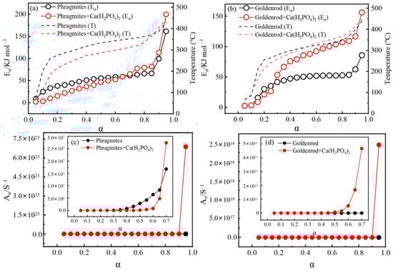 The effect of the Ca(H2PO4)2 addition on the activation energy during pyrolysis of phragmite (a) and goldenrod (b) biochars, and the changes in the pre-exponential factor of phragmite (c) and goldenrod (d) biochars after the Ca(H2PO4)2 addition.