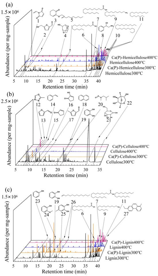 PY-GC-MS spectra of hemicellulose (a), cellulose (b), and lignin (c) biochars produced at 300 °C and 400 °C, with and without a Ca(H2PO4)2 addition. Main peaks were assigned to 1. 1-vinyl-1H-pyrrole-2,5-dione; 2. 5-hydroxymethylfurfural; 3. 2-ethoxy-2-cyclohexen-1-one; 4. 1,4:3,6-Dianhydro-ALPHA-D-glucopyranose; 5. 1-Decene; 6. palmitic acid; 7. octadecanoic acid; 8. 2-amino-1-phenylethanol; 9. hexadecanamide; 10. n-24 alkane; 11. n-18 alkane; 12. 2-Methyl-1,3,4-oxadiazole; 13. furfural; 14. styrene; 15. 2-cyclopenten-1-one; 16. 2-hydroxy-2-cyclopenten-1-one; 17. 5-methyl-2-furaldehyde; 18. naphthalene; 19. catechol; 20. N,2-dimethyl-N-nitroso-1-propylamine; 21. D-allose; 22. 1,6-anhydro-Β-D-glucofuranose; 23. phenol; 24. O-methoxyphenol; 25. 4-methylcatechol; 26. 1-tetradecene; 27. Phenanthrene.