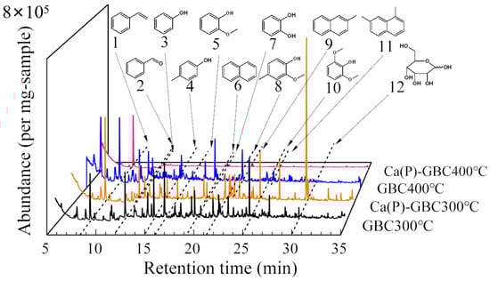 PY-GC-MS spectra of goldenrod biochars produced at 300 °C and 400 °C with and without a Ca(H2PO4)2 addition. Main peaks were assigned to 1. styrene; 2. benzaldehyde; 3. phenol; 4. p-cresol; 5. 2-methoxyphenol; 6. naphthalene; 7. catechol; 8. 2-methoxy-4-methylphenol; 9. 2-methylnaphthalene; 10. 2,6-dimethylphenol; 11. naphthalene-1,7-dimethyl; 12. D-allose.