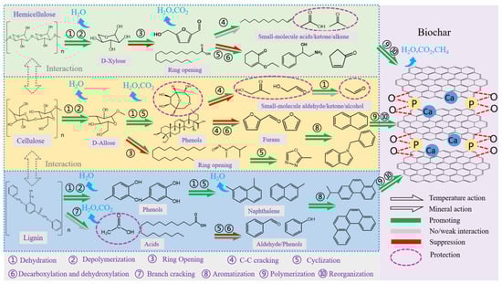 Based on analyses of the elemental composition, surface functional groups, carbon structural composition and volatiles of biochar, the interaction mechanisms governing the evolution of biochar’s carbon structure were summarized in Figure 9. Ca(H2PO4)2 enhanced dehydration and depolymerization at 300 °C. As the temperature increased, hemicellulose experienced depolymerization, ring-opening and C–C bond cleavage, resulting in the formation of small volatile acids and ketones. Simultaneously, hemicellulose inhibited these small molecules from undergoing secondary processes such as cyclization, recombination and polymerization. However, the addition of minerals catalyzed carboxyl group nucleophilic addition reactions, promoting cyclization and the formation of C=O and C=C structures, also protecting the small molecules. Some depolymerized hemicellulose products encapsulated around cellulose and lignin, thereby suppressing their degradation []. At 400 °C, Ca(H2PO4)2 primarily promoted the depolymerization of cellulose and the cleavage of lignin’s phenylpropane side chains []. Cellulose was decomposed to D-allose first and then continued to form saccharides and phenolics. Ca(H2PO4)2 significantly accelerated this process and promoted the cyclization of aldehydes and the formation of furans through dehydroxylation and decarboxylation []. As the temperature rose, reactions such as ring-opening and C–C bond cleavage also occurred. Minerals protected the generated small molecules such as aldehydes, ketones and alcohols, inducing the cyclization of chain alkanes. Under the combined influence of high temperature and minerals, aromatization reactions occurred and formed aromatic carbons such as naphthalene and anthracene. The depolymerization of lignin was accompanied by generation of phenolics and acids, which was primarily due to interactions with cellulose []. Ca(H2PO4)2 promoted the dehydration and cyclization of phenolics, as well as the cyclization of macromolecular acids, facilitating the formation of aromatic carbons. All aromatic carbon components polymerized and reorganized to form biochar with a graphite-like structure. The surface encapsulation of CaO, Ca2P2O7, and chemical bonding of C–O–PO3 and C–P, significantly enhanced the stability of biochar.