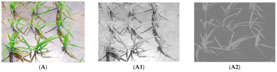 Figure 2 shows the conversion results of typical rice seedling images in different color spaces. The first column shows the original images taken under different natural illumination (sunny or cloudy conditions) and different paddy field backgrounds (water, soil) in RGB format. The corresponding G component images are shown in the second column. The contrast between rice seedling and the background in the G images is not obvious, and is affected by the variation of illumination. As shown in Figure 2(C1), rice seedlings and the background cannot even be distinguished by human vision. Unlike the G component, green chrominance information without luminance is described in the Cg component. As seen in Figure 2(A2,B2,C2), rice seedlings are clear and can be differentiated from the background with interference factors such as highlight, shadow and mud. Therefore, the Cg component is discarded mainly due to the color itself rather than the luminance component, which can enhance rice seedling information in paddy fields with illumination variations.