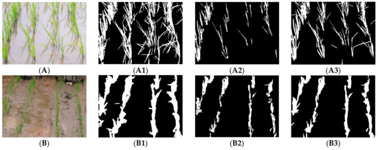 The rice seedling images and the processing results by applying the different graying processing methods: (A) the original image with shadow on a cloudy day; (A1–A3) the corresponding results of G component, ExG and 2Cg-Cr-Cb graying methods; (B) the original image with highlights on a sunny day; (B1–B3) the corresponding results of G component, ExG and 2Cg-Cr-Cb graying methods.