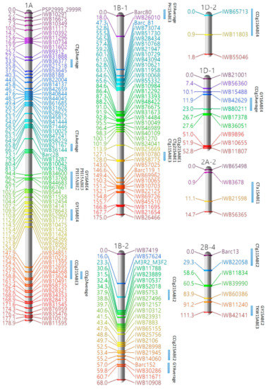 Molecular markers have been widely applied for genetic map construction, QTL detection, gene cloning, and MAS [15]. SNP markers are the most abundant polymorphisms in plant genomes [32], and thus, allow the high-throughput genotyping compared with previous marker platforms [30,31]. In the present study, we used the 90 K iSelect SNP array combined with SSRs to genotype a spring wheat DH population derived from a cross between UI and SY. Using 9687 polymorphic SNPs, 9330 previously mapped [31] and 357 newly mapped, we constructed a genetic map of 43 LGs that represented all the 21 chromosomes of bread wheat (Table S2) and had a total length of 3633.19 cm and an average marker density of 0.37 cm (Table S2). Our linkage map had a better marker distribution and a higher density compared with those reported in previous studies [11,23,50,51,52,53,54,55]. However, some gaps were observed in Chr. 1A and 1B-1. The A and B genomes were mapped by 4320 and 4367 markers, respectively, whereas the D genome by 1046 markers (Table S2), suggesting that the former genomes included more polymorphisms. These results were in agreement with those reported in previous studies [11,31,56].