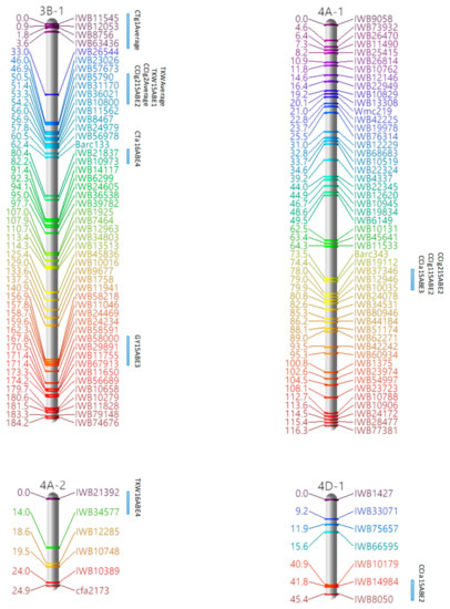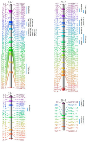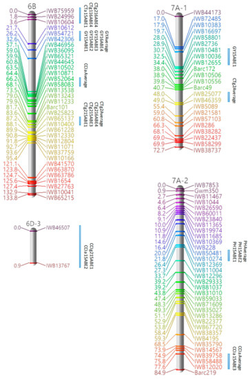 Molecular techniques have accelerated progress in plant breeding programs [14]. Of these, quantitative trait locus (QTL) mapping that is carried out to detect potential chromosome regions associated with important traits using molecular markers [15] has been proved to be an effective way to understand the genetic architecture of physiological and yield-related traits in crops [16]. In wheat, QTL mapping has been extensively conducted for PH, TKW, and GY [1,9,11,17,18,19,20,21,22,23,24] as well as for CT (or CT depression) and CCI (or SPAD), since these two traits are significantly correlated with GY and its components [9,10,11]. Some QTL for CT (or CT depression) and CCI (or SPAD) have been identified during anthesis or at 10 d (days) post-anthesis using different mapping populations and considered as potential tools for improving wheat yield under different stress environments [7,9,10,11,21,25,26,27]. QTL for CT during the vegetative and grain-filling stages have been identified on Chromosomes (Chr.) 1B, 2B, 3B, and 7A across different environments, whereas one QTL for CT during the vegetative stage has been identified on Chr. 4A [28]. Previous study reported QTL for CT during the vegetative (25 d after emergence) and grain-filling stages on Chr. 3A, 3BS, 3BL, 5B, and 7A under irrigated, heat, and drought conditions [21]. QTL for CT depression during anthesis have been mapped on Chr. 2AL, 3BL, 4BS, 5BS, and 6BL, whereas QTL for CT depression at 10 d post-anthesis on Chr. 4AS, 4BS, and 5BS [10]. QTL for SPAD at 0 d, 7 d, and 14 d post-anthesis have been detected on Chr. 1A, 1B, 1D, 2B, 3B, 4D, 6B, and 7B under unstressed conditions [29]; on Chr. 1A, 2B, 3A, 4A, 4D, 5B, and 6A at 0 d, 7 d, and 14 d post-anthesis under high-light stress conditions [7]; on Chr. 3D and 7A at the seeding stage under salt stress conditions [26]; on Chr. 7A during anthesis under different nitrogen and water conditions [25]; and on Chr. 1B and on 1A, 1D, 3A, 3B, and 5A under heat and drought conditions [28]. Previous study reported QTL for SPAD during anthesis on Chr. 2AS, 2AL (2), 2DS, 2DL, 3AS, 4AL, 4DS, 5AS, and 5AL, and at 10 d post-anthesis on Chr. 2AL (2), 2BS, 2D, 5AL, 5BL, 6AS, and 7A [11].