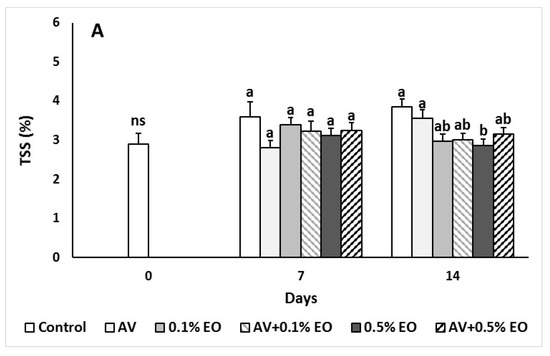 The TSS values ranged to similar levels at 7 days and significantly decreased (p < 0.05) in 0.5% EO-treated fruits after 14 days of storage compared to the control and AV treatments (Figure 3). The titratable acidity values of AV and/or EO treated fruits significantly decreased (p < 0.01) and the ripening index (TSS/TA ratio) was increased compared to the control (un-coated fruits) after 14 days of storage. This indicates that AV and/or EO treated fruits had increased sweetness compared to the control treatments. Acidity of raspberries subjected with A. vera gel did not differ with the untreated fruits after 8 days of storage [45] being in line with the current results for the 7 days of storage.