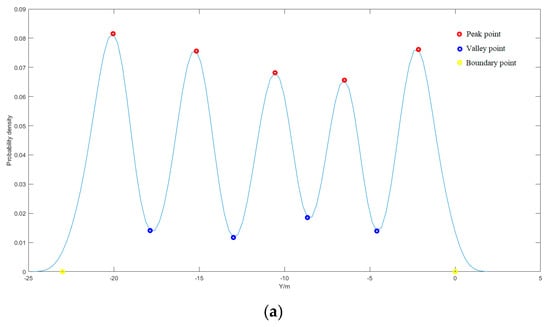 In Figure 5a, the peak, valley, and boundary values of the Y-axis probability density are marked with red, blue, and yellow circles, respectively. The Y-axis boundary and valley points were used for row segmentation. The Y and Ymax parameters corresponding to the Ymin and valley value were sequentially saved to a row segmentation position array, L, which ultimately stored the i+1 row positions (i is the number of rows). According to the boundary values, Xmax and Xmin, of the X-axis coordinates, the coordinates of the corner points in the X and Y axes of each row segment were (Xmin, L (m)), (Xmax, L (m)), (Xmax, L (m + 1)), and (Xmin, L (m + 1)), where the value range of m was from 1 to i. Finally, the point-cloud coordinates of each row segment were saved. The third step was the column segmentation following similar procedures, during which the probability density of the X-axis coordinates of each row segment were sequentially estimated, and then the peak and valley probability density values and their corresponding X values were determined. As shown in Figure 5b, the peak, valley, and boundary values of the X-axis probability density are marked with red, blue, and yellow circles, respectively. The X-axis boundary and valley points were used for column segmentation. The X and Xmax corresponding to the Xmin and valley value were sequentially saved to a row segmentation position array, C [7] (the number of columns in each row might vary), where i was the row number. The coordinates for column segmentation of each row were saved. According to the boundary values, L (m) and L (m+1), of each row, the coordinates of the corner points on the X and Y axes of each column and row segment were (C{m} (n), L (m)), (C{m} (n + 1), L (m)), (C{m} (n + 1), L (m + 1)), and (C{m} (n), L (m + 1)), where m is in the range of 1−i, i is the number of rows, and n is in the range of 1 to size (C{m})−1. Finally, the point-cloud coordinates of each row and column segment were saved.