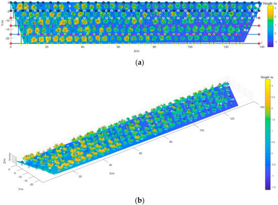 In Figure 7a, all the canopy-circumscribed equivalent circles are marked on the XOY plane view of the orchard point-cloud model. Figure 7b shows the highest points, the lowest points, and the height lines of all trees as well as the circumscribed equivalent circles on the XOY plane view. In Figure 7c, the circumscribed ellipsoids of all apple trees in the orchard point-cloud model are marked.