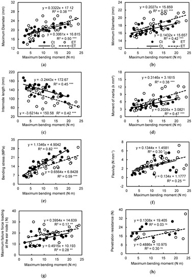 The internode bending strength was defined as the maximum bending moment supported by the internode at the failure location. Pearson’s correlation and linear regression analyses revealed significant positive correlation between internode bending strength and internode diameters, moment of inertia, bending stress, flexibility, maximum failure force loading at the ear node, respectively, while a significant negative correlation between maximum bending moment and internode length (Figure 5). Moreover, the bending stress had the highest r2 value of 0.82 (p < 0.0001) and 0.59 (p < 0.0001) among the mechanical parameters under control and ethephon-treated conditions, respectively. Not only was the linear regression line of ethephon treated group below the line of control, but the slope of the regression line of the ethephon-treated group was also about half that of the control group. Moreover, the r2 value of the internode maximum diameter, minimum diameter, internode length and moment of inertia ranged from 0.42 to 0.50 in the control group, and from 0.38 to 0.42 in the ethephon-treated group. In other words, the internode geometric properties had a medium strong correlation with the internode maximum bending moment. However, the correlation between internode bending moment and internode material properties, including penetration resistance and Young’s modulus, were weak.