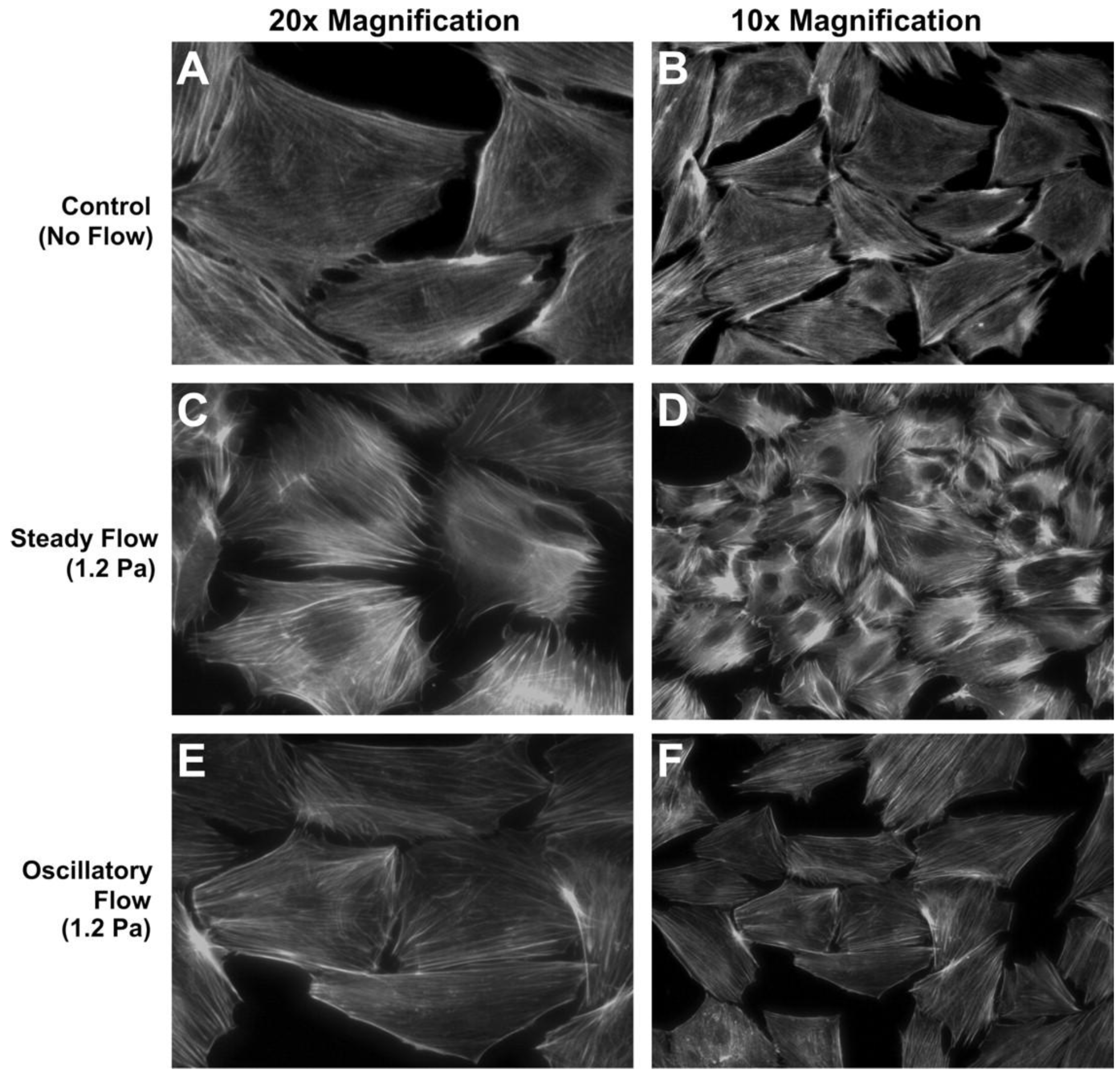 MC3T3-E1 cell response to steady or oscillatory fluid flow in 2D flow apparatus. (A,B) Unorganized F-actin stress fibers in static culture. (C,D) Organized stress fibers in response to 1.2 Pa steady flow. (E,F) No distinct stress fiber formation under 1.2 Pa oscillatory flow at 1 Hz.Reprinted with permission from the American Physiological Society (Malone et al. [16]).