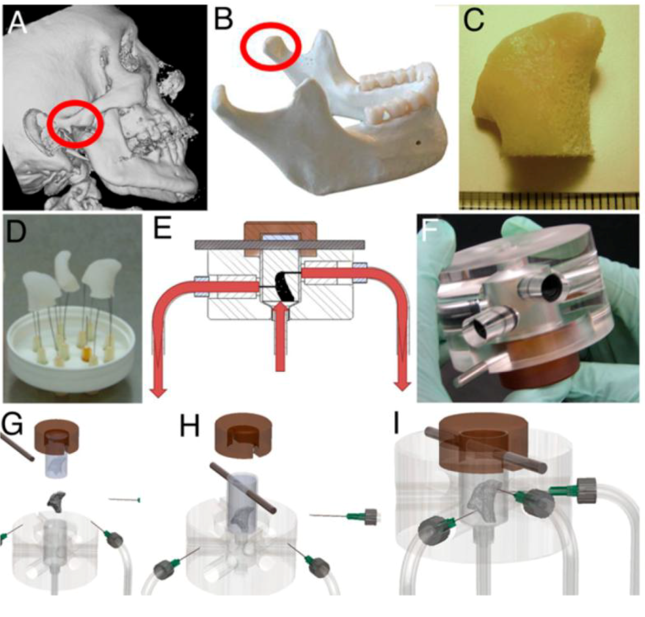 Tissue engineering of anatomically shaped bone grafts using 3D flow. (A,B) computed tomography (CT) images were used for the reconstruction of exact geometry of temporomandibular joint (TMJ)condyles. (C) Scanned data were used tomachine TMJ-shaped scaffolds from fully decellularized trabecular bone. (D) Image of produced scaffolds. (E) Human mesenchymal stem cells (hMSCs) were statically cultured for 1 week in the scaffolds, and then theperfusion was applied for additional 4 weeks.(F) Image of the perfusionbioreactor. (G–I) Keysteps in bioreactor assembly. Reprinted with permission from the National Academy of Sciences of the United States (Grayson et al. [60]).
