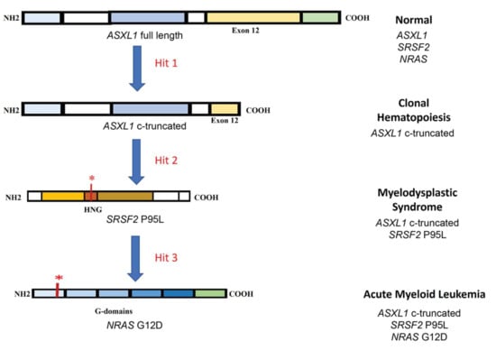 Schematic of clonal evolution of AML. The first step in the process is mutation in transcriptional regulator (ASXL1) resulting in a c-terminal truncated protein. The next step is a point mutation in hinge region (HGN) of the RNA splicing regulator (SRSF2) affecting the protein binding to canonical splicing enhancer sequences in RNA. The third hit is mutation in signaling molecule (NRAS) resulting in differentiation block and hyperproliferation. * indicates mutation.