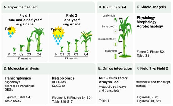 Experimental design and guide to datasets. (A) The sugarcane variety SP80-3280 was field grown under two planting seasons (Fall and Spring) with different climatic conditions and data and sample collection were done after 4 (C1), 8 (C2), 11 (C3) and 13 (C4) months after planting (P). (B) Plant material collected for molecular analysis: leaf +1 (L1), immature (I1), intermediate (I5) and mature internodes. A systems biology approach was taken to study the changes on (C) physiological, morphological, agrotechnological, (D) transcriptomics, and metabolomics levels. (E) The MOFA tool was used to point out the main metabolic pathways that were activated and altered throughout development. (F) Finally, comparisons between the results from Field 1 and Field 2 were done in each sugarcane tissue studied.
