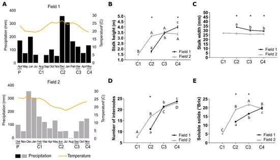 Precipitation and temperature during the initial months after sugarcane planting affect initial sugarcane elongation and stalk height, width, and soluble solids content at the stage of ripening. (A) Precipitation and temperature measures of fields 1 (F1) and 2 (F2). (B) Stalk-height, (C) stalk width, (D) number of internodes, and (E) soluble solids content in F1 and F2 in 4 (C1), 8 (C2), 11 (C3), and 13 (C4)-month-old plants. Letters and * are from the split2.crd results. Means with the same letter are not significantly different and means with different letters are significantly different between collection points. * shows differences between F1 and F2. Error bars show the standard error of the mean.