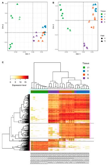 Multidimensional scaling (MDS) analyses of the transcriptomics data demonstrated that most of the variation within transcriptomics profiles is attributed to the differences between the distinct anatomical tissues. (A) Dim1 vs. Dim2; (B) Dim1 vs. Dim3. (C) Heatmap constructed using the top 500 most variable genes responsible for the variations in the different tissues. L1, I1, I5, and I9 refer to leaf +1 and immature, intermediate, and mature internodes. F1 and F2 refer to the plants that were planted in April 2012 and October 2012, respectively. C1, C2, C3, and C4 refer to sampling points at 4, 8, 11, and 13 months after planting.