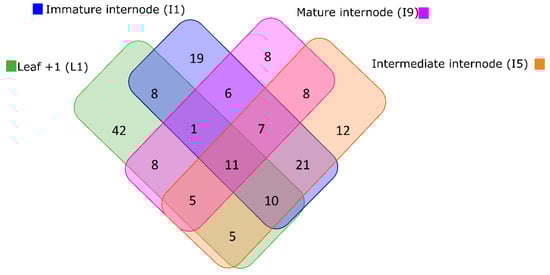 The Venn diagram shows that Leaf +1 presented a higher number of identified metabolites in the metabolite profiles generated via HPLC-MS of each tissue collected throughout sugarcane SP80-3280 development in both fields.