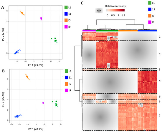 When the processed metabolomics datasets from all tissues (L1, I1, I5, and I9), sampling points (C1, C2, C3, and C4) and fields (F1 and F2) were concatenated for the generation of PCA and PLS-DA models, clear separations were observed between the four tissues (Figure 5) proving that the majority of the metabolic variation can be explained regarding the differences between the different tissues (L1, I1, I5 and I9) as was observed in the transcriptomics data (Figure 3).