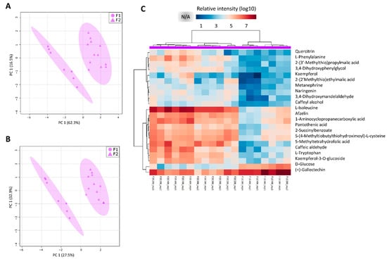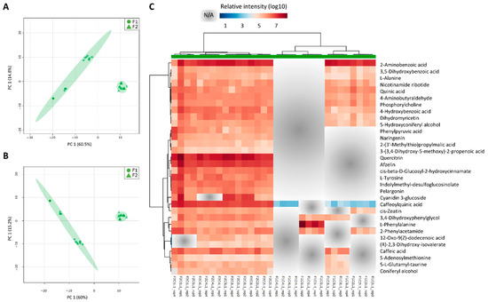 Leaf+1 metabolite profiles are different between fields 1 (F1) and 2 (F2). Discriminant models between field comparisons generated from the normalized and log10 transformed metabolomics data from the leaf +1 (L1) tissues, combining sampling points (C1, C2, C3, and C4) and experimental fields (F1 and F2). (A) PCA and (B) PLS-DA models for L1 (component 1 Q2 = 0.64317, R2 = 0.70436 and component 2 Q2 = 0.89506, R2 = 0.92523); (C) heatmap representation of the 32 main metabolites responsible for the separations (VIP scores ≥1.0 from PLS-DA analysis) and NA refers to non-detected metabolites.