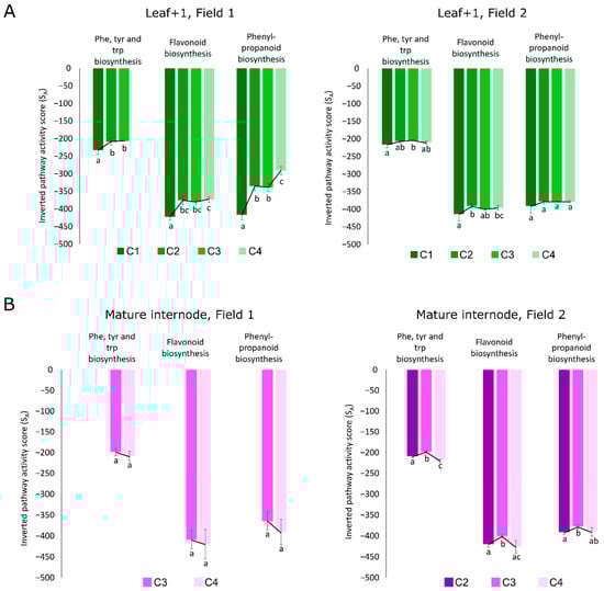 Pathway activities from the phenylalanine, tyrosine and tryptophan biosynthesis, flavonoid biosynthesis and phenylpropanoid biosynthesis. Pathway activities based on the pathway activity profiling (PAPi) tool of (A) leaves (L1) from F1 and F2; and of (B) mature internodes (I9) from F1 and F2. C1, C2, C3, and C4 refer to sampling points 1, 2, 3 and 4 specifically 4, 8, 11 and 13 months after planting. Bars with different letters (i.e., ‘a’ and ‘b’) indicate statistically significant differences between their activity scores based on ANOVA and Fisher’s LSD (p < 0.05) and bars with the same letters (i.e., ‘a’ and ‘a’) do not have activity scores statistically different.