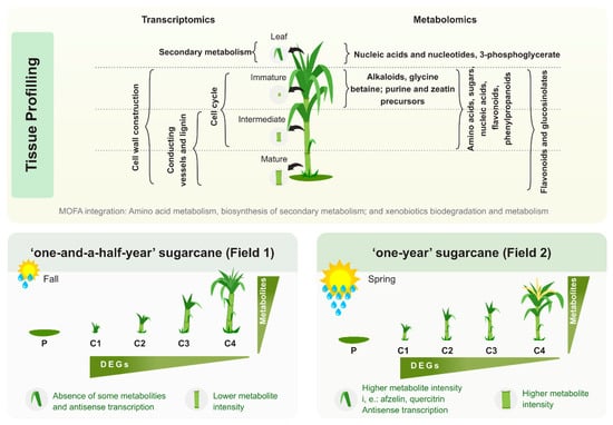 To reduce the potentially irreversible environmental impacts caused by fossil fuels, the use of renewable energy sources must be increased on a global scale. One promising source of biomass and bioenergy is sugarcane. The study of this crop’s development in different planting seasons can aid in successfully cultivating it in global climate change scenarios. The sugarcane variety SP80-3280 was field grown under two planting seasons with different climatic conditions. A systems biology approach was taken to study the changes on physiological, morphological, agrotechnological, transcriptomics, and metabolomics levels in the leaf +1, and immature, intermediate and mature internodes. Most of the variation found within the transcriptomics and metabolomics profiles is attributed to the differences among the distinct tissues. However, the integration of both transcriptomics and metabolomics data highlighted three main metabolic categories as the principal sources of variation across tissues: amino acid metabolism, biosynthesis of secondary metabolites, and xenobiotics biodegradation and metabolism. Differences in ripening and metabolite levels mainly in leaves and mature internodes may reflect the impact of contrasting environmental conditions on sugarcane development. In general, the same metabolites are found in mature internodes from both “one-year” and “one-and-a-half-year sugarcane”, however, some metabolites (i.e., phenylpropanoids with economic value) and natural antisense transcript expression are only detected in the leaves of “one-year” sugarcane.