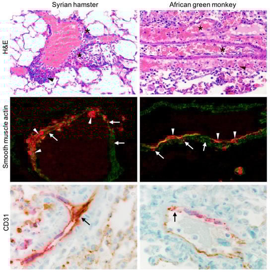 Lung tissue from hamsters (left column) and AGMs (right column) infected with NiV were sectioned and stained by H&E (top row). Asterisks denote degeneration of the endothelium, stars denote hemorrhage, and arrowheads highlight perivascular inflammation. NiV NP (red) and smooth muscle actin (green) are shown (middle row), arrows point to infected SMC, and arrowheads infected ECs, displaying syncytia. NiV NP (red) and CD31 (brown) are shown (bottom row), showing extensive colocalization and infection of ECs and the formation of multinucleated giant cells (arrows).