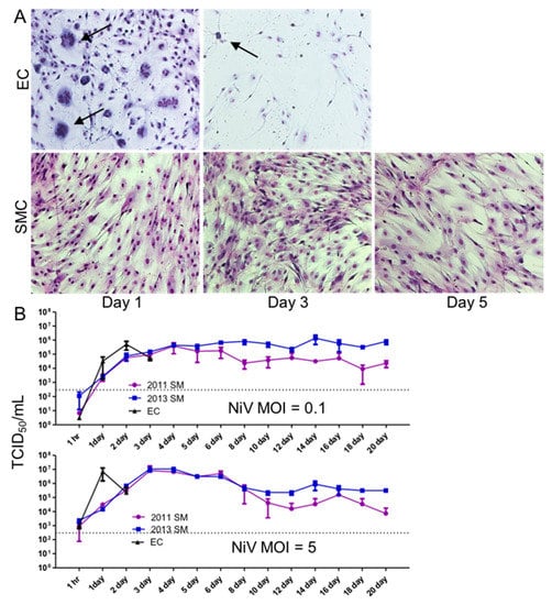 Cytopathic effect and replication of NiV in EC and SMC. (A). Monolayers of ECs and SMCs were infected with NiV at a MOI of 0.1 and cells were fixed and stained with Kwik-Diff for visualization. Arrows point to syncytia formation. Images were captured at 10× magnification. (B). ECs and SMCs were infected with NiV at a MOI of 0.1 or 5 and supernatants were collected at the indicated time points, and NiV was quantitated by titration using a TCID50 assay.