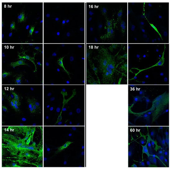 Since we did not observe CPE in the NiV-infected SMC cultures, we investigated the initial infection dynamics and the potential of SMCs to fuse, facilitating cell-to-cell spread of NiV. We performed an immunofluorescence time course experiment to directly compare the infection dynamics in SMC and EC cultures. Monolayers of each cell type were exposed to NiV at a MOI of 5 and stained for NiV NP over the course of 2.5 days, at matched time points. The NP of NiV was first detected in ECs 8 h post-infection, and in SMCs 2 h thereafter (Figure 3). By 12 h, ECs showed evidence of the initiation of fusion, followed by large syncytia and infection of 100% of the monolayer by 14 h. A complete destruction of the monolayer was achieved 2–4 h later. In contrast to ECs, infection of SMCs remained focal, with no syncytia formation observed, and no evidence of cell-to-cell spread at any time point. Continuing the experiment until 60 h, many cells remained uninfected, as indicated by the absence of NP staining. This result indicates that not only do SMCs not fuse or form syncytia, only a portion of the cells become infected, despite a high MOI and the continuous presence of infectious progeny virus in the supernatant, as shown in Figure 2B.