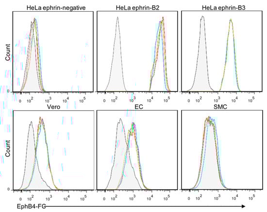 Expression of ephrin-B2/3 on ECs and SMCs. The respective cells were surface stained using recombinant EphB4 (the ligand for ephrin-B2/3) fused to human FC receptor (EphB4-FC), followed by an Alexa 647-conjugated anti-FC secondary antibody. Flow cytometry was performed and grey histograms show negative controls and colored lines represent stained cells from three independent experiments. HeLa cells were used as a negative control, and HeLa cells that stably express ephrin-B2 or B3 were used as positive controls for the assay.