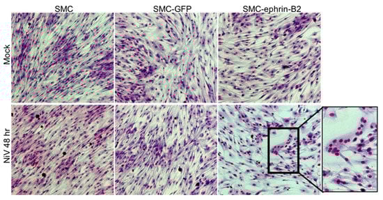 Transfection of SMCs with human ephrin-B2 driven by a CMV promotor expression plasmid (Sino Biological Inc., Chesterbrook, PA, USA) or plasmids encoding the fusion protein (F) and glycoprotein (G) of NiV was performed using a Nucleofector kit for primary SMC transfection (Lonza, Walkersville, MD, USA). The NiV F and G expression plasmids were described previously []. Cells (5 × 105) in the Nucleofector solution were mixed with plasmid DNA (1 µg of ephrin or 1 µg each of F and G plasmids) and loaded into a cuvette. The A033 program was used, after which the medium was added and cells were plated in 12-well plates. In the case of NiV F and G plasmid transfection, SMCs were co-cultured with ECs the day after transfection, then stained with Kwik-Diff 2 days later, and assessed for syncytia formation using light microscopy. Two days after transfection with plasmids encoding ephrin-B2, SMCs were infected with NiV at a MOI of 5 and then stained with Kwik-Diff and assessed for syncytia formation.