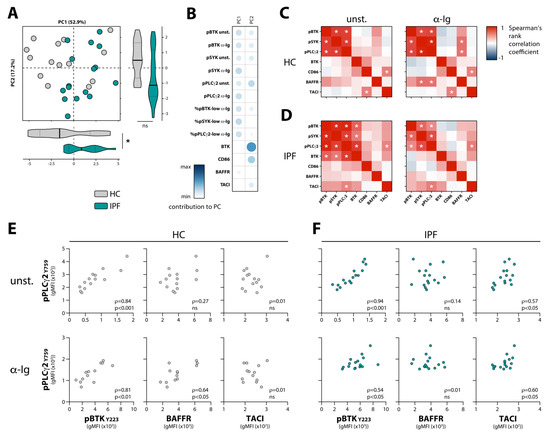 Correlation analysis of ex vivo measured B cell markers and in vitro measured phosphorylation of BCR signalosome molecules in naïve (CD3−CD19+CD38loCD27−IgD+) B cells from HCs and IPF patients (cohort 1). (A) Principal component analysis (PCA) of BCR signalosome molecules and B cell activation markers and (B) the individual contribution of each variable to PC1 and PC2 from IPF and HC naïve B cells. (C,D) Spearman’s rank correlation matrix for (C) HCs and (D) IPF patients for the indicated markers measured ex vivo and phosphorylated proteins of unstimulated (unst.) and BCR-stimulated (α-Ig) naïve B cells. (E,F) Spearman’s rank correlation analysis of (E) HCs and (F) IPF patients for the correlation of pPLCγ2 with pBTK, BAFFR, and TACI in unstimulated (unst.) and BCR-stimulated (α-Ig) naïve B cells. Subjects are indicated by individual data points. * p < 0.05 in (A) by an unpaired two-tailed Student’s t-test; ns, not significant.