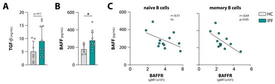 Analysis of circulating BAFF and TGF-β levels in HC and IPF patients (subset of cohort 1). (A) TGF-β levels in plasma of HCs and IPF patients measured by ELISA. (B) BAFF levels in plasma of HCs and IPF patients measured by ELISA. (C) Pearson correlation analysis between BAFF levels in plasma and BAFFR surface expression on naïve (CD3−CD19+CD38loCD27−IgD+) and memory (CD3−CD19+CD38loCD27+) B cells in IPF patients. Subjects are indicated by individual data points, and bars indicate mean values + SD. * p < 0.05 in (B) by an unpaired two-tailed Student’s t-test.