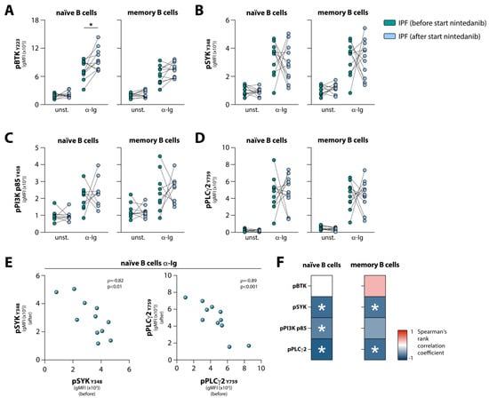 Phosphoflow analysis of BCR downstream signaling in nintedanib-treated IPF patients’ peripheral blood B cells (cohort 2). (A–D) Phosphorylation levels in unstimulated (unst.) conditions and after α-Ig stimulation for (A) pBTK Y223, (B) pSYK Y348, (C) pPI3K p85 Y458, and (D) pPLCγ2 Y759 in naïve (CD3−CD19+CD38loCD27−IgD+) and memory (CD3−CD19+ CD38loCD27+) B cells from IPF patients before and after the start of nintedanib treatment. (E,F) Spearman’s rank correlation analysis of the phosphorylation levels for (E) pSYK (left) and pPLCγ2 (right) in naïve B cells following BCR stimulation, before versus after the start of nintedanib treatment. (F) Spearman’s rank correlation matrix for phosphorylation of BCR signalosome molecules before and after the start of nintedanib treatment. Subjects are indicated by individual data points. * p < 0.05 in (A) by a paired two-tailed Student’s t-test.