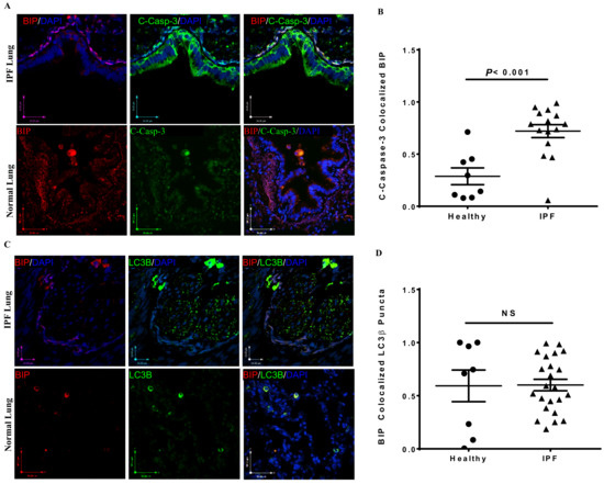 We have chosen LC3β as one of the key markers of autophagosome formation based on published literature [26,27] and our own findings [28,29,30]. Quantitatively, the measurement of autophagosomes is based on the numbers of puncta stained with LC3β. Increased LC3β puncta do not necessarily demonstrate autophagy flux but indicate the exact numbers of autophagosomes without differentiation between formation and degradation. GRP78 (BiP) is an ER chaperon that is responsible for the docking of the three UPR sensors (IRE1, ATF6, PERK). We have previously shown that immunohistochemical staining for BiP is a reliable marker for the activation of UPR (16, 30). Hence, we used this approach in our current work. Additionally, we also used XBP/sXBP to monitor the activation of the IRE arm of UPR signaling. XBP/sXBP plays an important role in organ fibrosis, including that of the lung [16] and the gut [31]. Further, we chose cleaved caspase-3 as an apoptosis marker as it is the key caspase for cell death [32,33]; we have demonstrated this approach in our previous study [30]. Of note, we did not use cleaved PARP-1 as an apoptosis marker since PARP-1 is a marker for DNA repair mechanisms via PARylation and may, therefore, interfere with the repair mechanism(s) in IPF [34].