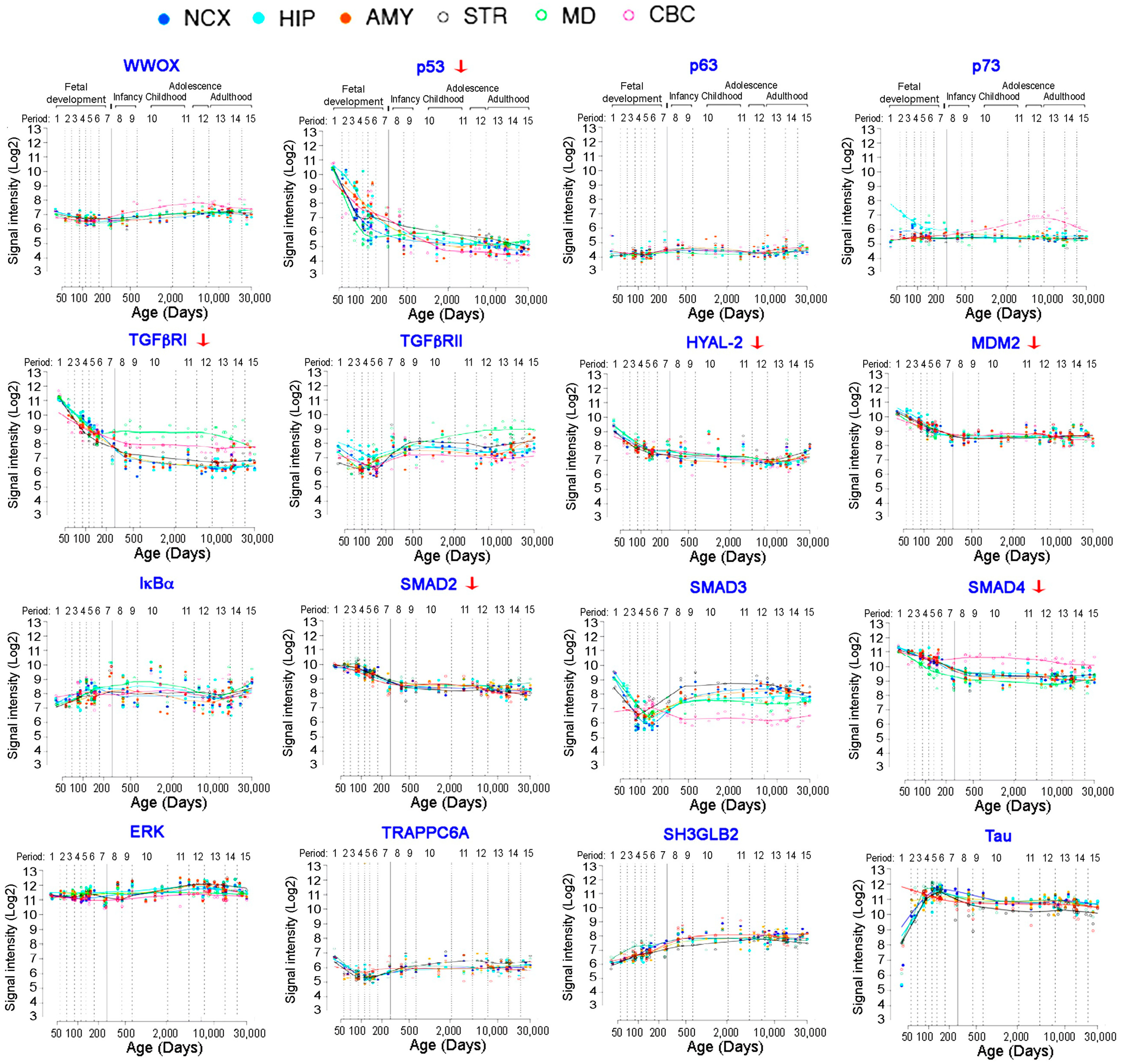 Figure 2. Selected gene expression profiles in the brain with age. Six gene-encoded proteins, including p53, TGFβRI, Hyal-2, MDM2, Smad2 and Smad4, are known to participate in growth suppression and apoptosis. Notably, their gene expression tend to downregulate with age. The gene expression data are from the database of the Human Brain Transcriptome (https://hbatlas.org/pages/hbtd) [85,86]. Gene expression is shown from the brain areas, including cerebellar cortex (CBC), mediodorsal nucleus of the thalamus (MD), striatum (STR), amygdala (AMY), hippocampus (HIP), and 11 areas of neocortex (NCX). Certain genes are not downregulated with age, and their encoded proteins participate in the IκBα/WWOX/ERK [54] and WWOX/TGFβRII signal pathways [47]. However, proapoptotic proteins, including p53, Hyal-2, Smad4, and WWOX, tend to undergo downregulation with age.
