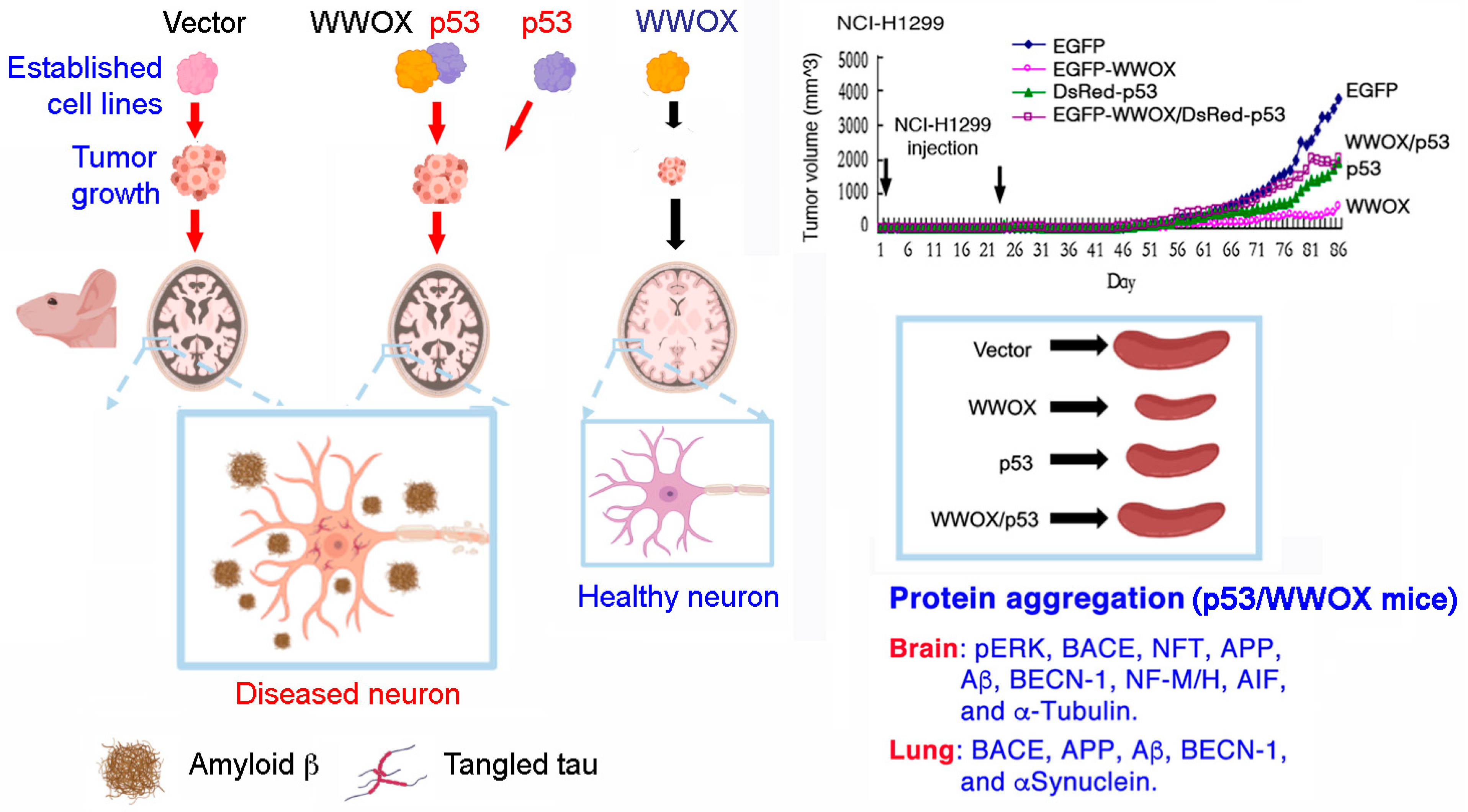 Figure 3. p53 may functionally antagonize the biological functions of WWOX in vivo. Four stable transfectants of NCI-H1299 cells with vector only, WWOX, p53, or WWOX/p53 mammalian expression vectors, were established [76]. Subcutaneous inoculation of these established cells in nude mice revealed that WWOX is most effective in cancer suppression and inhibition of inflammation (splenomegaly), as compared to p53 [76]. p53 inhibits the effect of WWOX in blocking cancer growth. Protein aggregates, including pERK, BACE, APP, Aβ, NFT, and α-tubulin, are found in the brains of p53/WWOX-NCI-H1299 mice, but not in other mice. Protein aggregates in the lung are also observed.