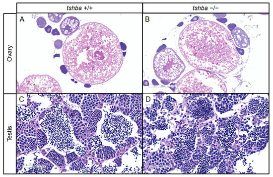 Initially, no progeny was obtained from the mating between homozygous tshba mutant parents. To further address the reasons for reproductive performance defects in tshba mutant zebrafish, histological analyses of gonadal tissues in the tshba mutants were conducted. Surprisingly, the histological structures of the gonads were not affected in either male or female tshba mutant zebrafish, when compared with the wild-type zebrafish gonads. Similar patterns of oocytes were observed in both tshba mutant ovaries and those of wild-type control fish (Figure 5A,B), and similar histological features of the male germ cells were observed in both tshba mutant and wild-type testes (Figure 5C,D). Thus, the maturation of gonads in the tshba mutants was not affected.