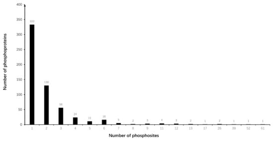 In total, 595 DPPs with 1412 phosphosites were identified in NF-PitNETs compared to controls (p < 0.05) (Supplementary Table S2). A representative MS/MS spectrum of phosphopeptide is shown, which is phosphopeptide 633TPEELDDS*DFETEDFDVR652 ([M+H]+, m/z = 1234.51, z = 2+, S* = phosphorylated serine residue) derived from catenin alpha-1 (P35221) (Figure 1), with a good MS/MS spectrum, high S/N ratio, and excellent b-ion and y-ion series (b1, b3, b4, b5, b6, b7, b8, and b9; y1, y2, y4, y5, y7, y9, y10, y11, y12, and y17). The phosphorylation site was localized to the amino acid residue Ser641, and the phosphorylation level was significantly increased (ratio of T/N = 1.36, p = 1.56 × 10−3) in NF-PitNETs compared to controls (Supplementary Table S2). Similarly, each DPP and its phosphosites were identified and quantified. Supplementary Table S2 shows the accession number, gene name, protein name, modified peptide, phosphosite, phosphorylated probabilities, ion score, protein score, and phosphorylated levels. Among 595 DPPs with 1412 phosphosites, 333 DPPs had 1 phosphosite, 130 DPPs had 2 phosphosites, 56 DPPs had 3 phosphosites, 24 DPPs had 4 phosphosites, 11 DPPs had 5 phosphosites, 16 DPPs had 6 phosphosites, 5 DPPs had 7 phosphosites, 2 DPPs had 8 phosphosites, 3 DPPs had 9 phosphosites, 4 DPPs had 11 phosphosites, 3 DPPs had 12 phosphosites, 2 DPPs had 13 phosphosites, 1 DPP had 17 phosphosites, 2 DPPs had 26 phosphosites, 1 DPP had 39 phosphosites, 1 DPP had 52 phosphosites, and 1 DPP had 61 phosphosites (Figure 2). Among these 595 DPPs, 89 DPPs had the significantly decreased phosphorylation levels, and 506 DPPs had significantly increased phosphorylation levels (Figure 3); these 506 DPPs with increased phosphorylation levels included four DPPs (FGA, CDS2, DNM1, and SRRM1) that were only phosphorylated in NF-PitNETs but not in controls (Supplementary Table S2).