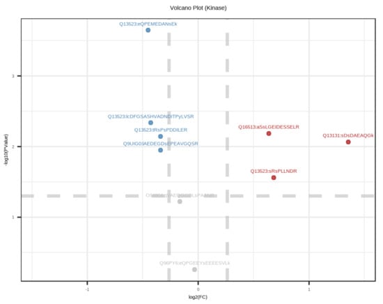 The human genome has been documented as encoding 518 protein kinases by means of transferring a phosphate-group from ATP to serine, threonine, as well as tyrosine residues []. The majority of these kinases are involved in human cancer initiation and progression. In this study, the PhosphoSitePlus database was used to analyze the kinases for the identified phosphoproteins in NF-PitNETs and controls, which identified seven kinases, including GRP78, WSTF, PKN2, PRP4, LOK, NEK1, and AMPKA1 (Table 2; Figure 4). Of them, the substrates of kinases PKN2 and AMPKA1 were DPPs (Supplementary Table S2; Table 2). The recent advancements in small-molecule kinase inhibitors for the treatment of various types of cancer have proven particularly successful in clinic. Moreover, protein kinases are the second largest target destination of drugs after the G-protein coupled receptors []. For example, PKN2 is a PKC-related serine/threonine-protein kinase and it is related to tumor cell migration, invasion and apoptosis []. For AMPKA1, the protein is the subunit of the 5′-prime-AMP-activated protein kinase (AMPK), which belongs to the ser/thr protein kinase family. AMPK is a cellular energy sensor in eukaryotic cells whose activity is activated by the stimuli and could increase the cellular AMP/ATP ratio. AMPK mediates the activities of numerous key metabolic enzymes by means of phosphorylation. It protects cells from stresses which induce ATP depletion by means of switching off ATP-consuming biosynthetic pathways [,]. Therefore, these kinases and their substrates might represent new drug targets for NF-PitNETs and provide new ways of thinking to investigate pathogenesis and therapeutic approaches in NF-PitNETs.