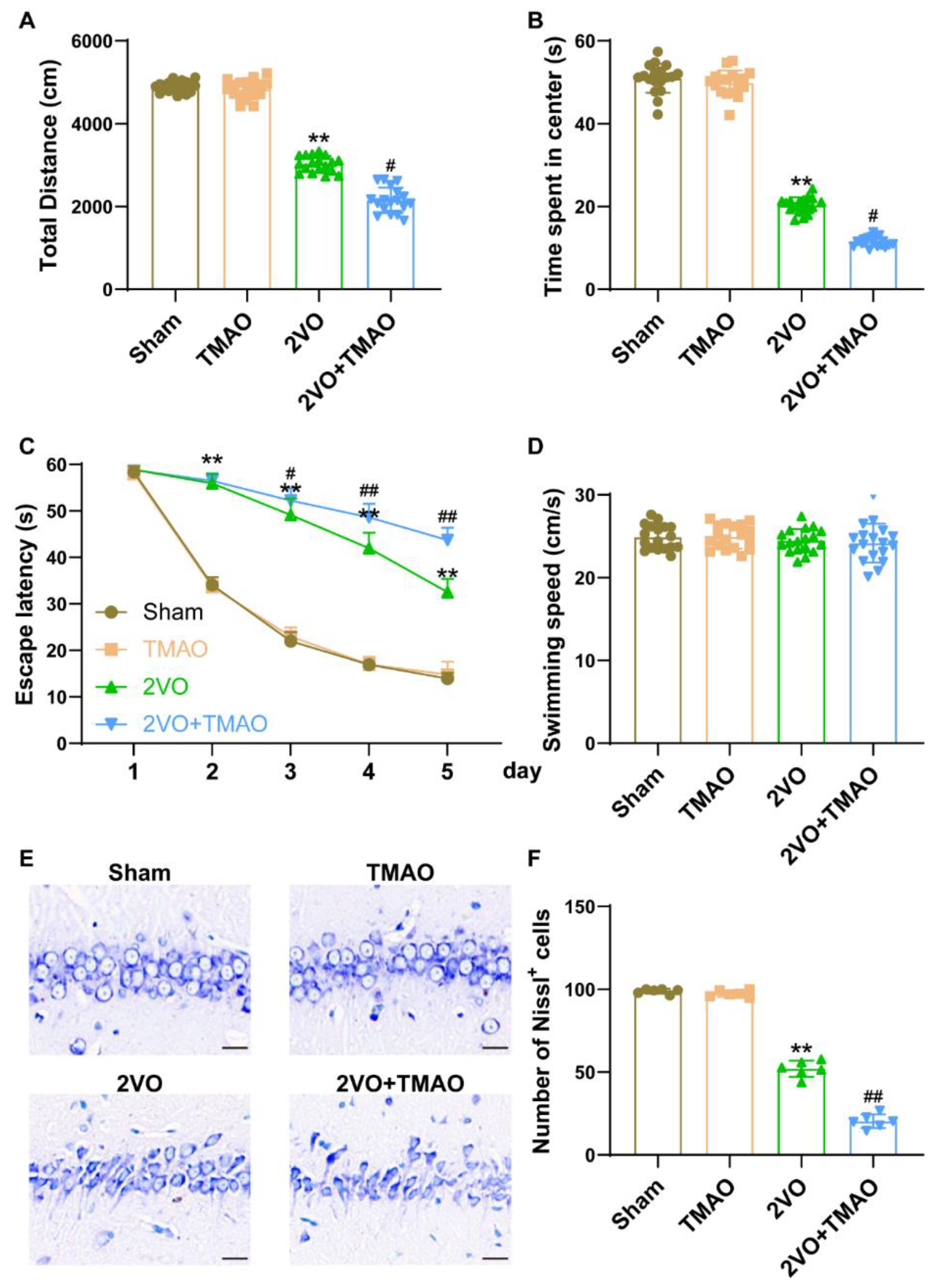 3.2. TMAO Aggravated Cognitive Function Deficits in 2VO Rats