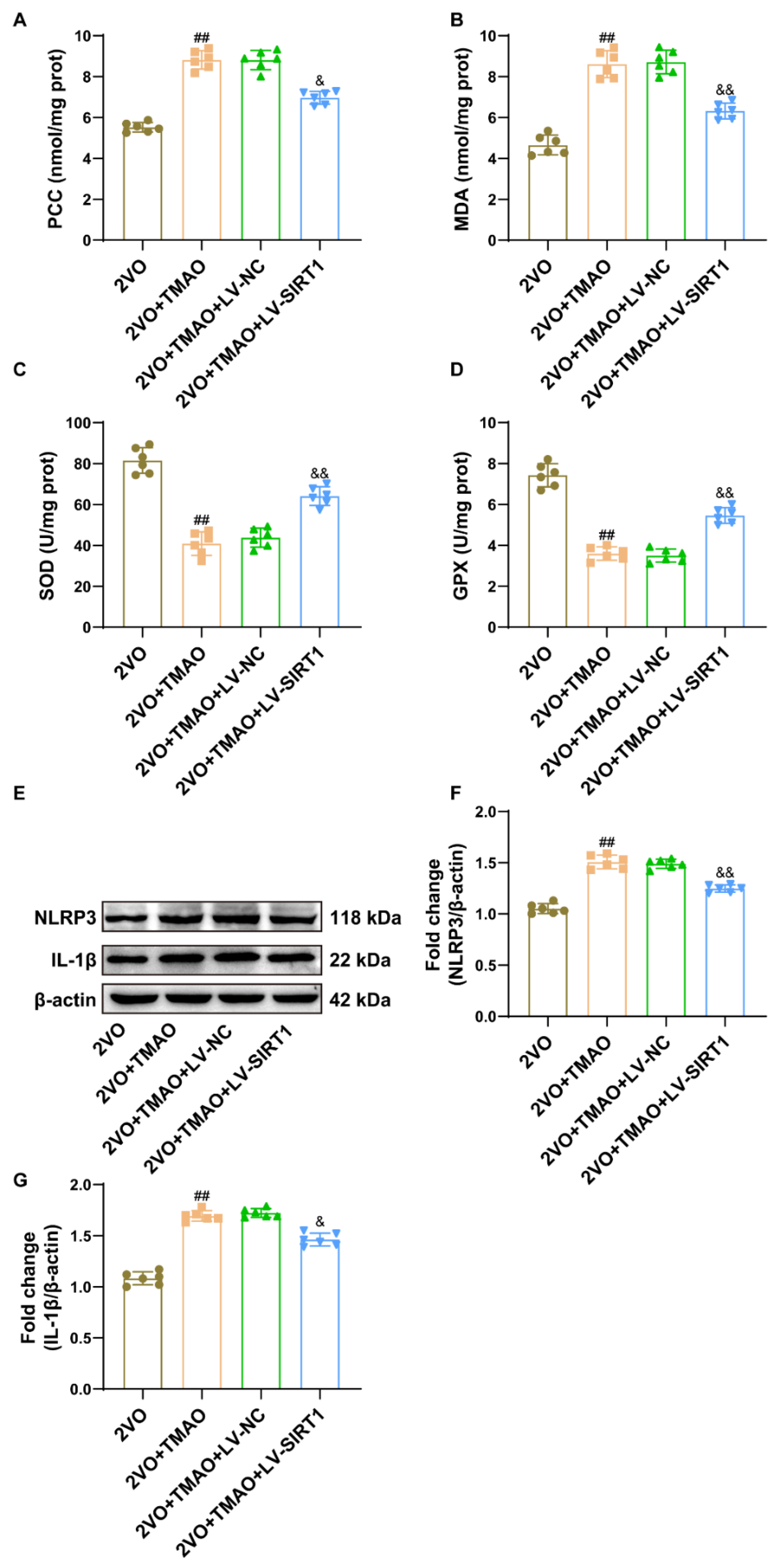 3.9. TMAO Promoted Neuronal Oxidative Stress and NLRP3 Inflammasome Signaling through a SIRT1-Based Pathway within 2VO Rats