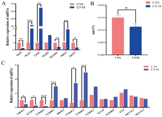 The analysis of muscle-related marker genes and the detection of m6A level at different development stages of cattle-yaks: (A) relative expression of muscle-related marker genes between six-month-old cattle-yaks (CY6) and eighteen-month-old cattle-yaks (CY18); (B) overall m6A content between CY6 and CY18; (C) the identification of expression levels of methylation-related genes. “***” p < 0.001, “**” p < 0.01, “*” p < 0.05.