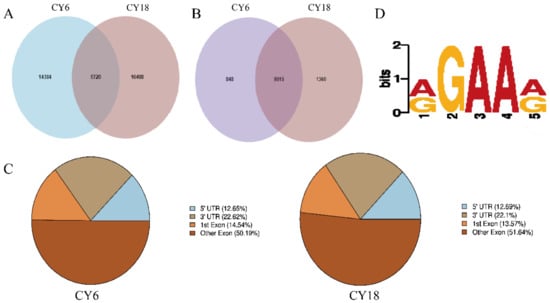 Peak calling was performed by MeTDiff software, and we detected 20,104 and 22,218 peaks in Group eighteen-month-old cattle-yaks (CY18) and six-month-old cattle-yaks (CY6), respectively. The peaks in the two groups represented transcripts of 9863 genes and 10,375 genes. Among them, there were 14,384 CY6-unique peaks and 16,498 CY18-unique peaks, respectively (Figure 2A,B). Interestingly, the results showed that the m6A peaks per gene in cattle-yak skeletal muscle (~3.0) were generally higher than those in bovine skeletal myoblasts and myotubes (~1.60 m6A peaks per m6A transcript) [], human HepG2 (∼1.7 m6A peaks per gene) [] and pig adipose tissue (∼1.3 m6A peaks per gene) []. It can be seen from Figure 2C that most of the peaks were concentrated in the exon region, followed by the 3’UTR and 5’UTR regions, and the enriched results were consistent with previous reports of yaks [,]. Next, the significant peaks were analyzed to determine whether m6A peaks contained the m6A methyltransferase-combined consensus motifs. Consistent with previous reports, the results showed that the m6A peaks were typically present in RGAAR (R = A or G) motif [], which enhances credibility of the m6A peaks (Figure 2D).
