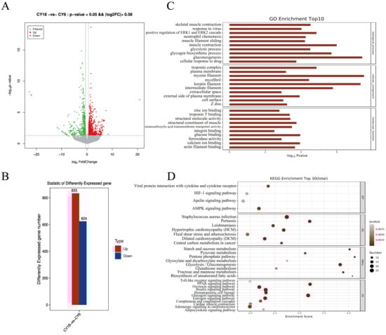 The transcripts were reassembled to perform the lncRNA prediction and potential peaks analysis on lncRNAs using String Tie software. After a rigorous screening process, 8388 lncRNAs were identified. As shown in Figure 6A, about 73.30 % of the lncRNAs were sense lncRNAs. According to the results of FC > 1.5 and p < 0.05, a total of 857 lncRNAs were finally identified as differentially expressed lncRNAs (DELs). Moreover, compared with the cattle-yaks of group CY6, we found 293 up-regulated lncRNAs and 564 down-regulated lncRNAs (Figure 6B). To further explore the potential functions of the DELs, GO and KEGG pathway analysis were performed. The GO results showed that the DELs were significantly enriched in cell cycle, protein glycosylation and signal transduction terms (Figure 6C). According to the KEGG analysis, there were some disease-related and muscle-related pathways to be significantly enriched in, such as hypertrophic cardiomyopathy pathway, MAPK signaling pathway and cardiac muscle contraction (Figure 6D).