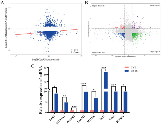 Integrated analysis of DEPs and DEGs: (A) positive correlation between m6A methylation and mRNA expression level (r = 0.1751, p < 0.001); (B) distribution of genes with a significant change in m6A methylation level and gene expression; (C) the results of qRT-PCR for verifying the RNA-seq data. “***” p < 0.001, “**” p < 0.01, “*” p < 0.05.