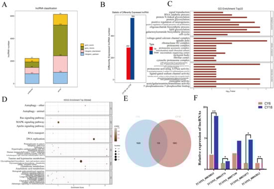 Identification and characterization of lncRNAs identified in the Longissimus dorsi muscle of cattle-yaks at different development stages: (A) classification of the identified lncRNAs in group CY6 and CY18; (B) number of up- and down-regulated differentially expressed lncRNAs (DELs); (C) GO analysis of DELs; (D) KEGG pathway analysis of DELs; (E) the common and specific m6A peaks on the lncRNAs in two groups; (F) the differentially expressed lncRNAs were testified using qRT-PCR. “**” p < 0.01, “*” p < 0.05.