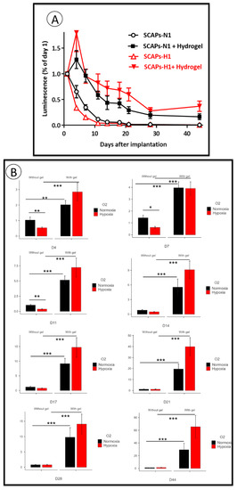 Stem cells are influenced by the local environmental physical and biochemical cues within their niches. Hydrogels are attractive materials able to mimic the complex microenvironment of cells and tissues [32,33,34]. The stiffness, viscoelastic properties and topography of the extracellular matrix (ECM) are instrumental in controlling stem cell fate. Natural polymer (chitosan, collagen, alginate)-based hydrogels are promising 3D scaffolds as artificial tissues because of their biocompatibility, biodegradability and tissue-equivalent construction [35,36,37]. A new generation of injectable thixotropic hydrogels, which gel efficiently at 37 °C and re-liquefy upon mechanical constraints, have been recently commercialized. Some of these gels are enriched in ECM proteins or with various types of peptides, enabling specific properties for tissue repair [38,39]. We used one of them, enriched in ECM components, to test the impact of the preconditioning of SCAPs under low O2 concentration in a subcutaneous engraftment model [34,40,41,42,43,44,45].