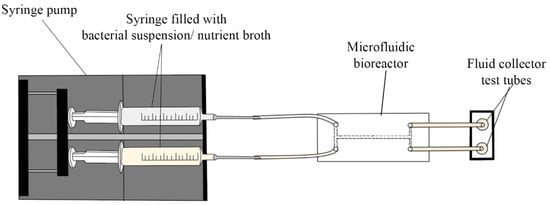 For biofilm cultivation in the 3D-printed microfluidic bioreactor, the same quantities as previously described were used, but the bacterial solution and the broth were drawn in two syringes (5 mL each) connected to the silicon tubes attached to the inlets of the system, as presented in Figure 3. The flow rate used was of 0.3 mL/min at room temperature to pump the fluid through the microsystems. Once the flow rate stopped, the microfluidic device was cultivated at 37 °C for 6 h, 12 h, 24 h, 3 days, 5 days and 7 days, respectively. This way, the initial step in biofilm formation—adhesion—was analyzed. The 3D-printed microfluidic devices were then sectioned longitudinally, along the main channel, using a Robotec laser cutting machine.